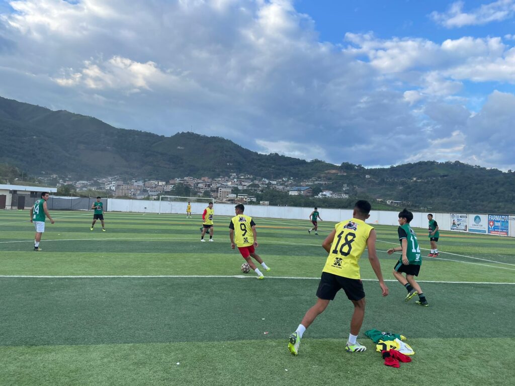 Los jugadores del Club Charapanos FC durante un intenso entrenamiento previo a la semifinal. En la imagen, se observa al equipo trabajando bajo la dirección del técnico Manuel Abad y el asistente Mario Gonzales. Los jugadores, se preparan con gran esfuerzo y concentración para el enfrentamiento contra Ecuagenera.